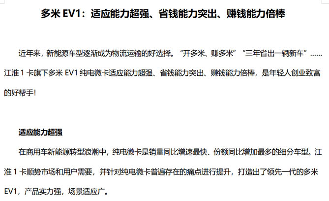 近年来,新能源车型逐渐成为物流运输的好选择。“开多米、赚多米”“三年省出一辆新车”……江淮1卡旗下多米EV1纯电微卡适应能力超强、省钱能力突出、赚钱能力倍棒,是年轻人创业致富的好帮手!适应能力超强在商用车新能源转型浪潮中,纯电微卡是销量同比增速最快、份额同比增