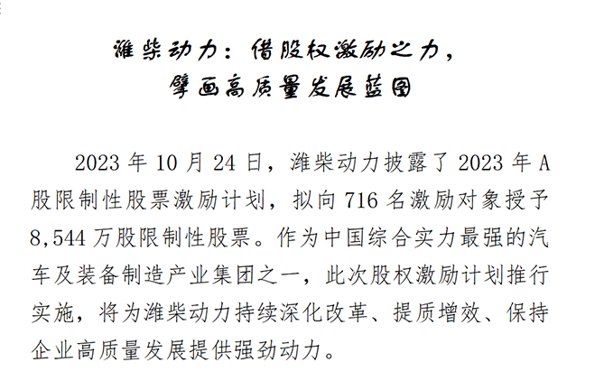 2023年10月24日,潍柴动力披露了2023年A股限制性股票激励计划,拟向716名激励对象授予8,544万股限制性股票。作为中国综合实力最强的汽车及装备制造产业集团之一,此次股权激励计划推行实施,将为潍柴动力持续深化改革、提质增效、保持企业高质量发展提供强劲