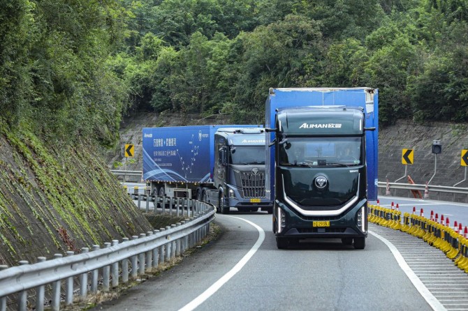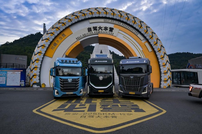 10月3日,欧曼银河全球价值品鉴之旅(混动篇)车队从成都出发,经乐山抵达雅安。面对川西的复杂路况,欧曼银河9与银河5M混动重卡以技术应对挑战——银河9搭载福康13L 620大马力混动专用发动机,热效率突破50%,比油耗低至169g/kW·h,发动机节油可达5%