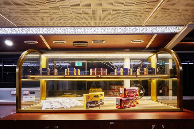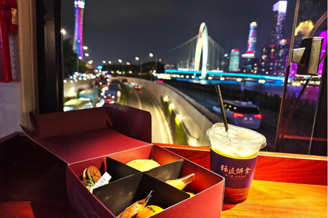上车之后,一层是茶点备餐和产品周边区域。升级版的粤式茶点,搭配充满广州特色的奶茶,为您的行程别添一番风味,还可以收获精美的双层巴士模型,当做美好行程的留念。