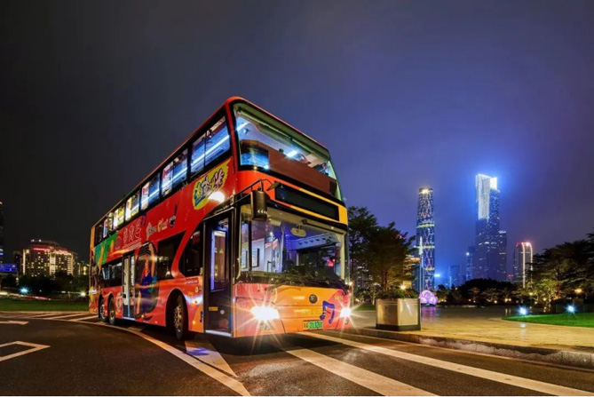 伴随着悠扬经典的粤语老歌传来,一辆醒目酷炫的双层巴士缓缓驶来,整车外观简约时尚,车身涂装靓丽吸睛,LED前、后大灯尽显科技未来感;更大的乘坐空间,更广阔的视野,为大家带来卓然不同的乘坐体验。