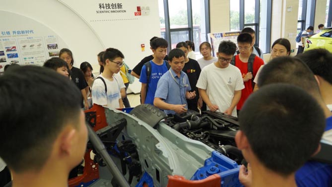 研学期间,讲解员带领同学们参观了全过程数字化高效协同、精益敏捷的大规模智能制造低碳工厂,了解了乘用车的构造及原理,同时也向同学们展示了汽车设计及冲焊涂的数字化管理。