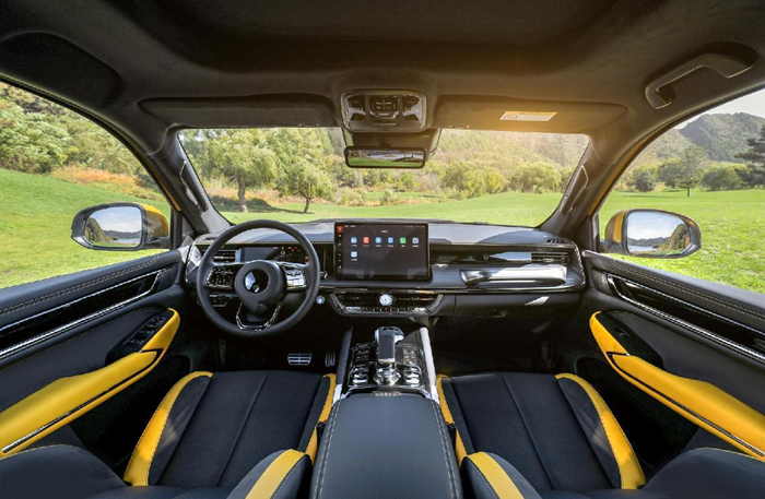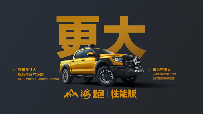 更大,全地形出行头等舱。山海炮性能版车身尺寸为5462mm*1992mm*1960mm,接近全尺寸级别,是同级最大、最宽、最舒适的驾乘空间。首创后排电动滑移,靠背角达33度,后排空间领先同级,是国内皮卡市场唯一可以带家人舒适出行的皮卡。