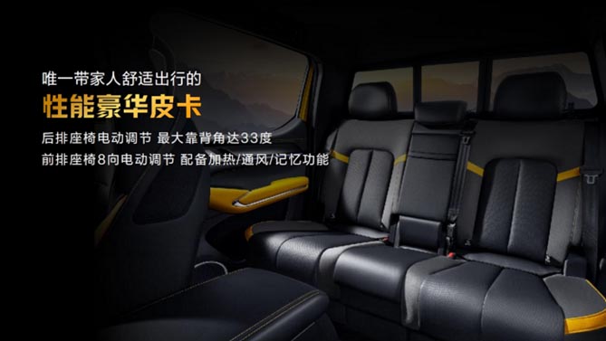 同时,山海炮性能版在国内首创后排座椅电动调节,采用宽大的4+2+4分块模式设计,两侧座椅可电动滑移,保证上下车便利性,最大乘坐靠背角达到33度,舒适度比肩大型豪华SUV,是国产皮卡中唯一可以带家人舒适出行的皮卡。