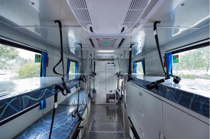 推休息舱后部有一扇外开旋转式舱门式可进入工具舱,舱内左右侧有序装配仪器的带箱门的工具箱,车内空间合理设计排布,最大化利用了空间。仪器架安装有气囊式压紧功能,前部设防撞架,后部安装钢制滚轮及环形链条及卡扣,确保仪器在取、放、运输中安全可靠。