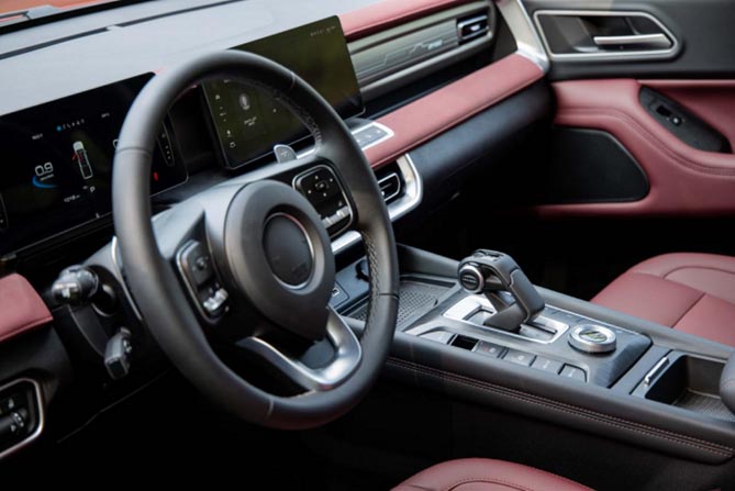 与此同时,车内采用大量软质包覆,搭配威尼托红颜色,质感高级触感细腻。12.3英寸智联触控屏+7英寸彩色液晶仪表双悬浮设计,配合镭雕工艺发光装饰板,增加科技感与豪华感。还搭配50W无线快充,手机放上即可轻松充电,彻底告别“电量焦虑症”。加上自动大灯、电动天窗、蓝牙钥匙等越级装备,为你打造乘用车级的全新豪华体验。