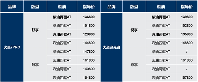 除了动力、尺寸、内饰之外,还有客户最关注的价格,火星7 Pro全系标配采埃孚8AT,柴油版13.68万起,汽油版12.98万起,相比大道追光者自动挡而言,柴油版13.98万起,汽油版12.18万起。