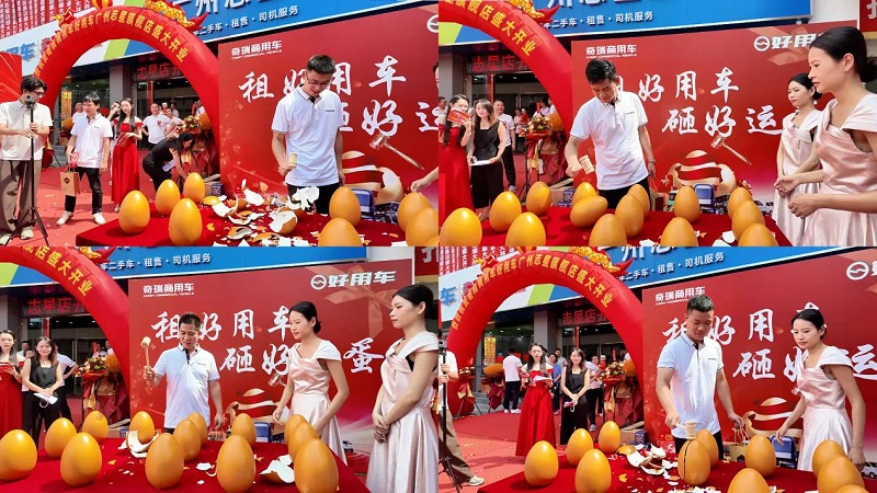 交车仪式后,本次开业庆典的另一个重磅环节——“租好用车 砸好运蛋”火热来袭,将现场的欢乐气氛推向了一个新的高潮。主持人宣布活动开始后,8位首批车主分为两组,满怀期待地走向砸金蛋区。