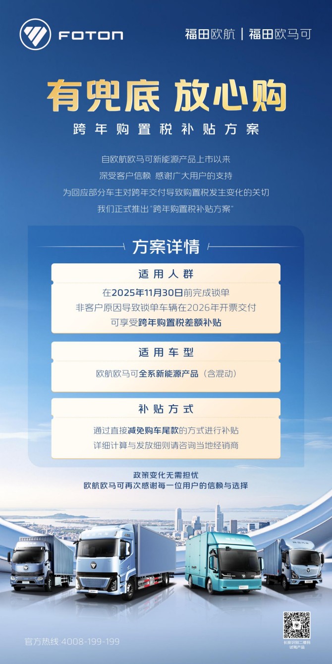 客户需在2025年11月30日24:00前,与福田公司或福田授权经销商签订购车合同并支付定金完成锁单,就有机会享受购置税差额补贴政策。当出现非客户原因导致该锁单车辆在2026年开票交付的情形时,客户可享受跨年购置税差额补贴,具体的补贴细则可咨询当地经销商。