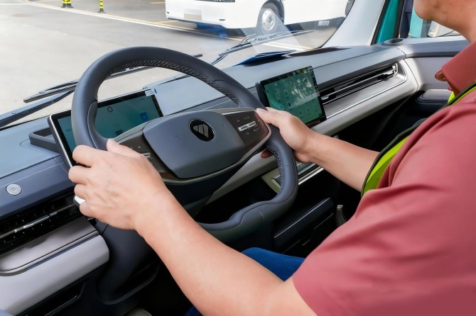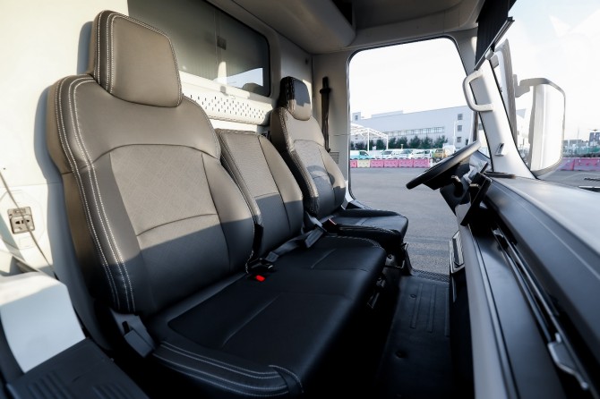 如果说三电系统决定了下限,那座舱配置可能决定价值上限。欧马可Z将MPV体验搬进了驾驶室,让枯燥货运变成一种享受。全球首创470mm的一级踏步设计的背后是对底盘架构的重新布局,是对卡友群体生存现状的深刻洞察;纯平地板、2米2站立高度、49°方向盘倾角、电子手刹、怀挡设计等MPV级座舱体验,这些以往只在乘用车上出现的配置成为了轻卡新配置,是企业人文关怀的进一步体现。