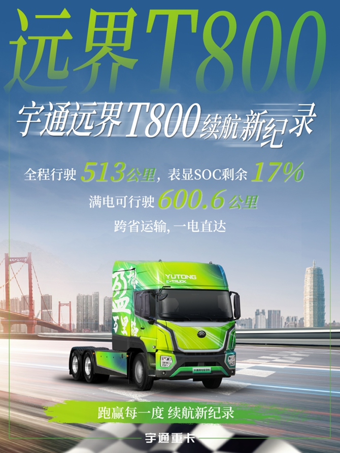 宇通远界T800的确实力出众。600公里超长续航,长距离运输直达,加上快充补能迅二者协同,可让用户跨省运输真正实现“说走就走”,效率直接飙升。